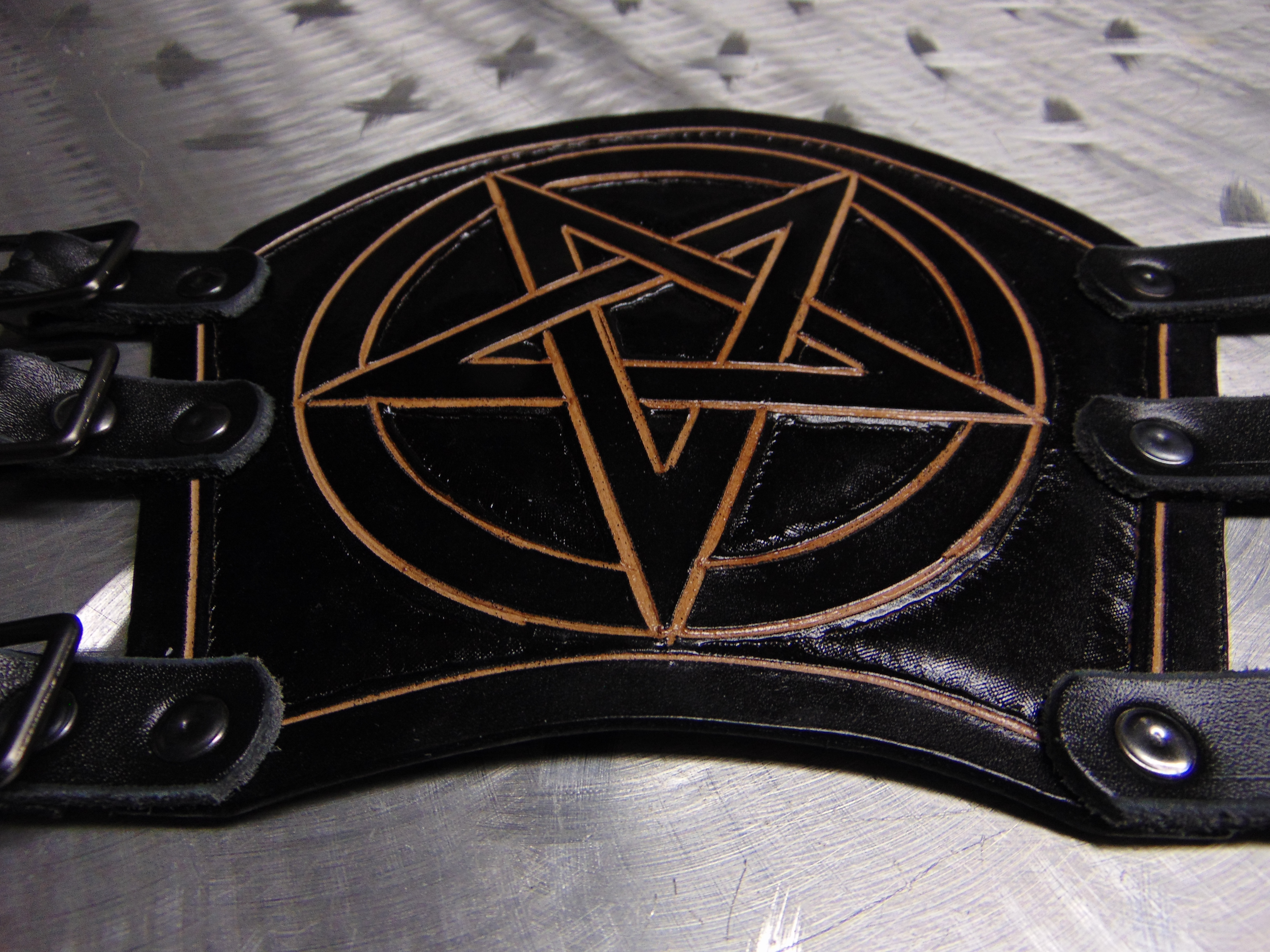 BRUJERIA LEATHER CARVED & TOLLED PENTAGRAM GAUNTLET Mexico (MDLG0152)